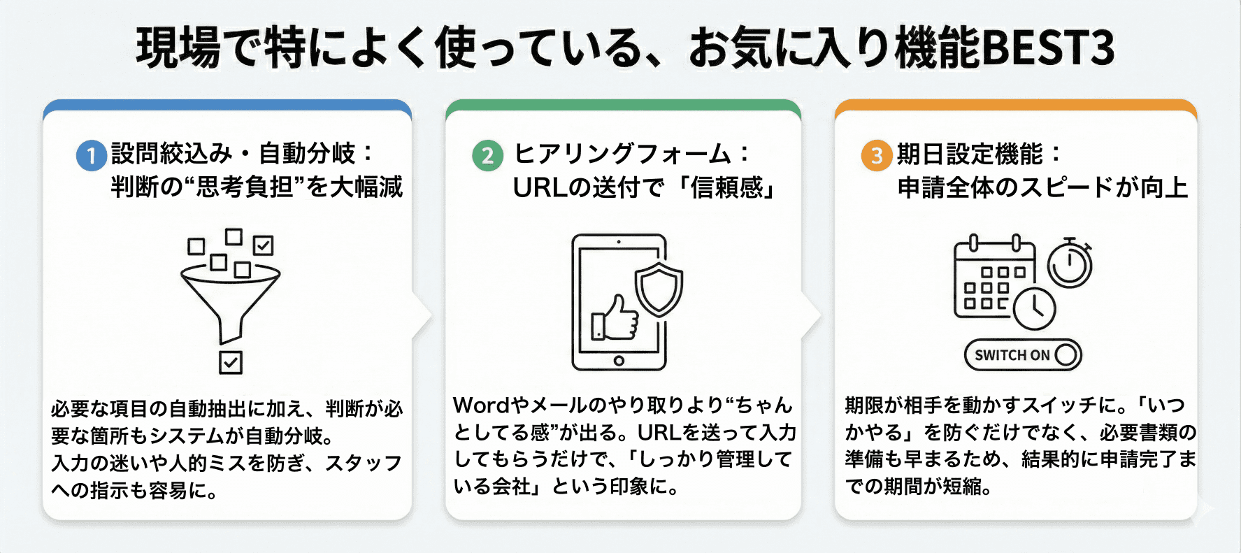 黒田先生一番助かっているのは「設問絞込み」です。100以上の入力項目から、案件に必要な項目だけが自動抽出されるので、入力に迷わず進められる点がとても助かっています。入力範囲が明確なので、アルバイトスタッフにも説明しやすいです。「設問絞込み」に類似しますが、システムに搭載された自動分岐機能も非常に便利です。「このケースなら次の入力これしかあり得ない」といった判断が自動でかかるため、判断にかける思考負担が大きく減りました。労働時間や給与計算も自動化されているため、人的ミスを最小限に抑えながら手続きが進む点は非常に心強いです。